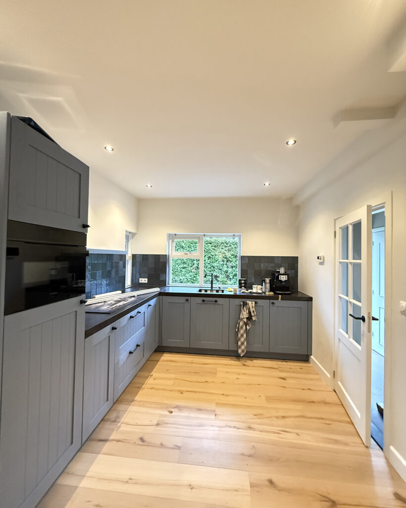 Voor een strak en egaal plafond is latex spuiten de ideale techniek. Wij zorgen voor een professionele afwerking door het plafond eerst voor te bereiden: we schuren en impregneren het oppervlak zorgvuldig, wat zorgt voor optimale hechting en een langdurig resultaat. Vervolgens brengen we met een latex verfspuit gelijkmatige lagen aan, wat een gladde, streeploze afwerking oplevert zonder zichtbare rolbanen of aanzetten. Of het nu gaat om een nieuw gestuukt plafond of het vernieuwen van bestaand schilderwerk, met onze werkwijze krijgt uw plafond een frisse, professionele uitstraling.